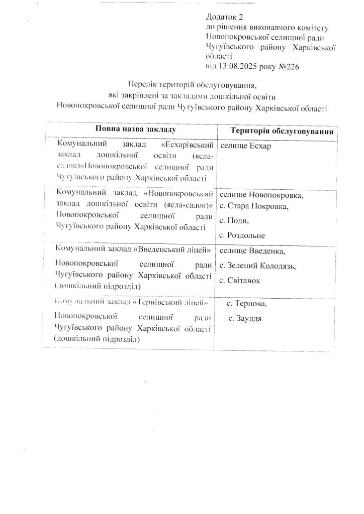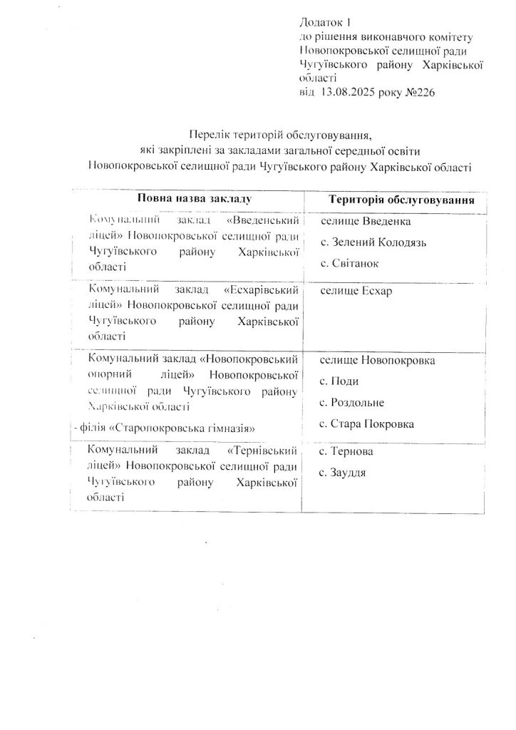 Інформація про закріплення за Введенським ліцеєм території обслуговування