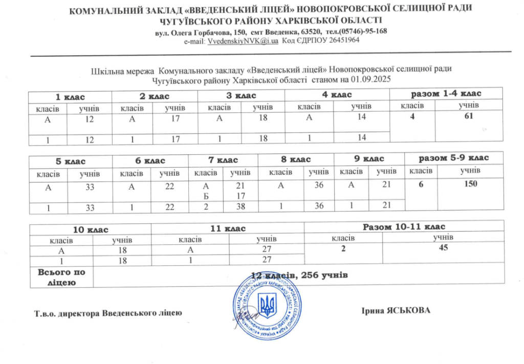 Шкільна мережа Комунального закладу «Введенський ліцей» Новопокровської селищної ради Чугуївського району Харківської області на 2025/2026 н.р.