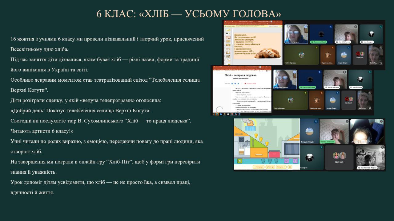 16 жовтня, до Всесвітнього дня хліба, шестикласники стали учасниками театралізованого уроку «Телебачення нашого селища». Діти читали твір В. Сухомлинського «Хліб — то праця людська» по ролях, виразно передаючи повагу до праці людини. Завершилася зустріч онлайн-грою «Хліб-Піт», що закріпила знання про традиції й символіку хліба.