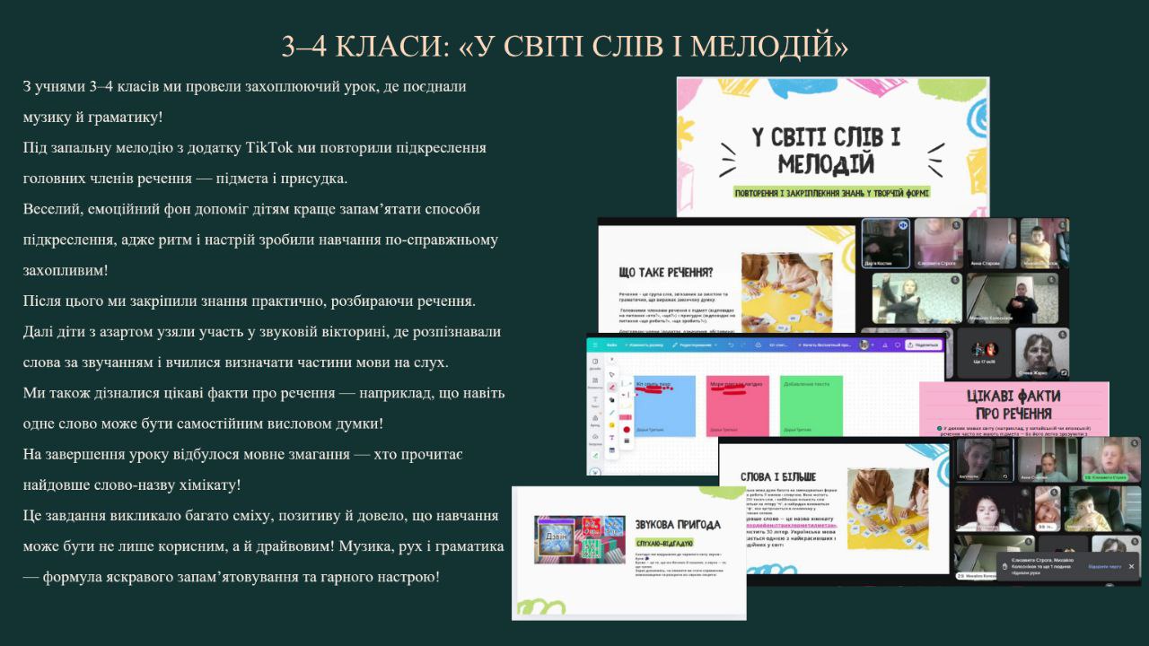 З учнями 3–4 класів ми поєднали музику й граматику під час веселого уроку під запальну мелодію з TikTok. Повторювали головні члени речення, проводили звукову вікторину, змагалися у вимові найдовшого хімічного слова! Музика, рух і позитив створили чудовий настрій і допомогли запам’ятати матеріал.