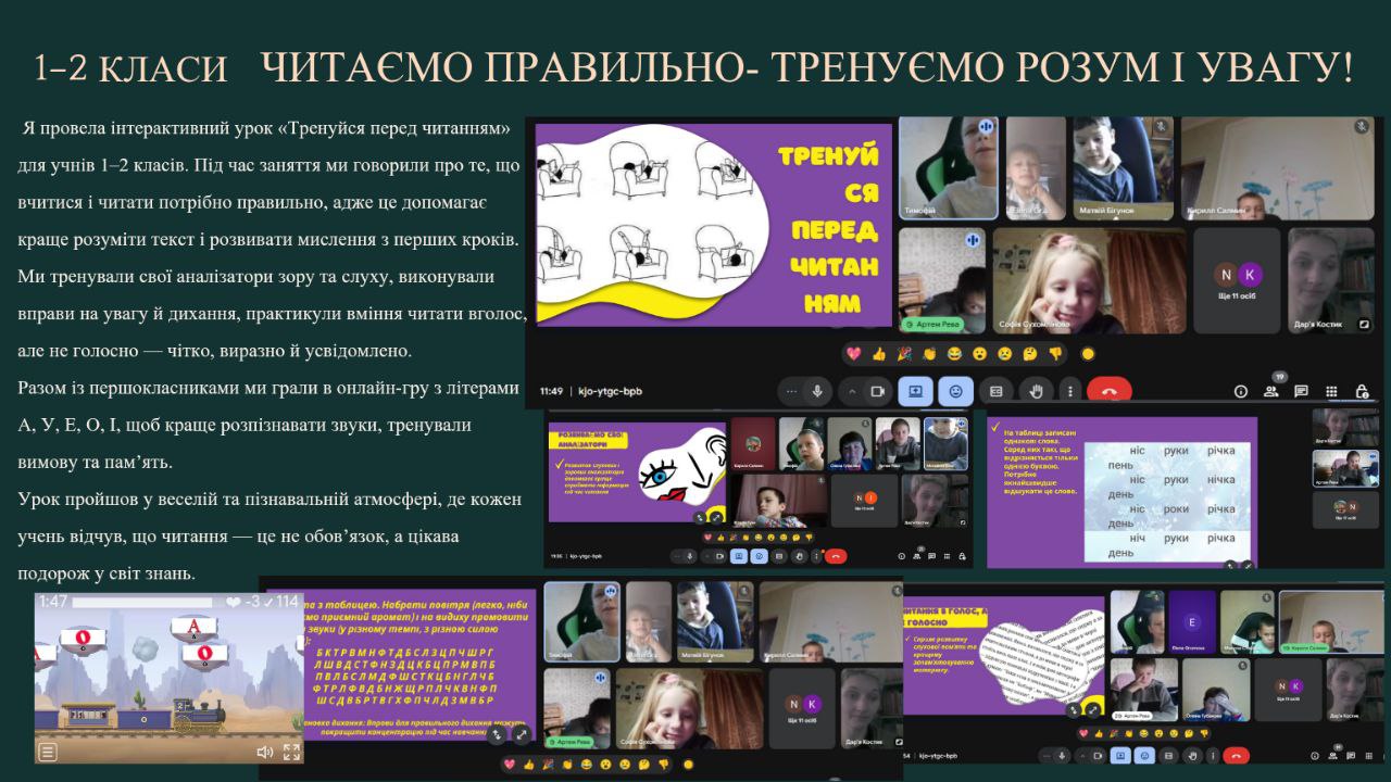 Для учнів 1–2 класів проведені заняття «Тренуйся перед читанням», де ми говорили про важливість правильного читання, тренували зір, слух, увагу та дихання.